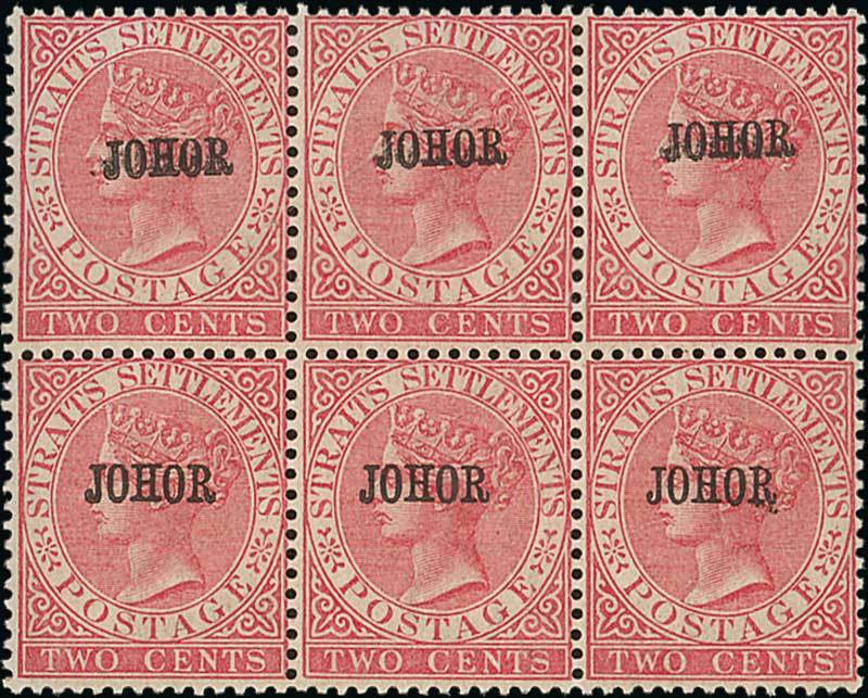 2c. pale rose with Type 12, a block of six (3x2) with the upper row showing variety overprint double, fine unused with large part original gum. A very rare multiple. S.G. 12/12a, £2490+. Photo