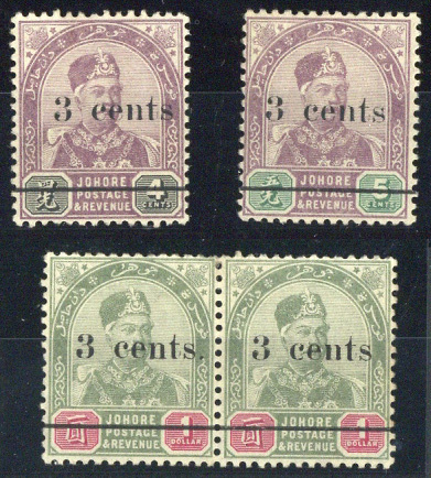 1894 (Mar.) 3c. on 4c., 3c. on 5c. and 3c. on $1 pair, each showing variety no stop, the pair with some shortish perfs at top otherwise fine mint. S.G. 28a, 29a, 31/31a; £747