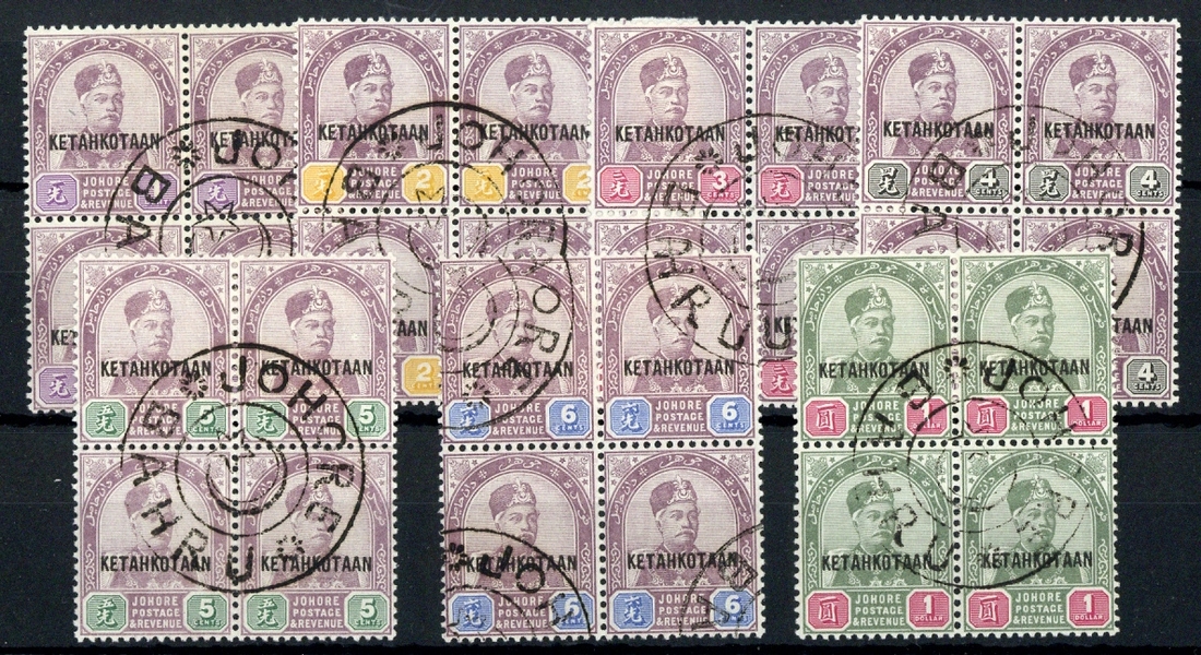 1896 (Mar.) Coronation, "ketahkotaan" 1c. to $1 set of seven in blocks of four, each centrally cancelled to order with circular "johore/Star and Crescent/bahru" double-ring h.s., fine. S.G. 32a-38a, £900