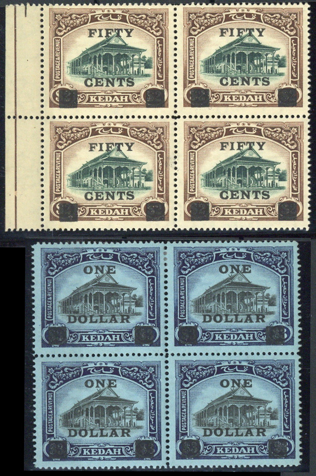 1919 (Mar.) 50c. on $2 and $1 on $3, both in a block of four, the former marginal, fine mint. S.G. 24-25, £360