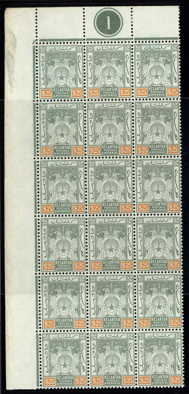 1911-15 MCA $25 green and orange top left corner block of eighteen (3x6) with plate number, some pink paper fibres adhering to reverse otherwise fresh and fine mint. S.G. 12, £900