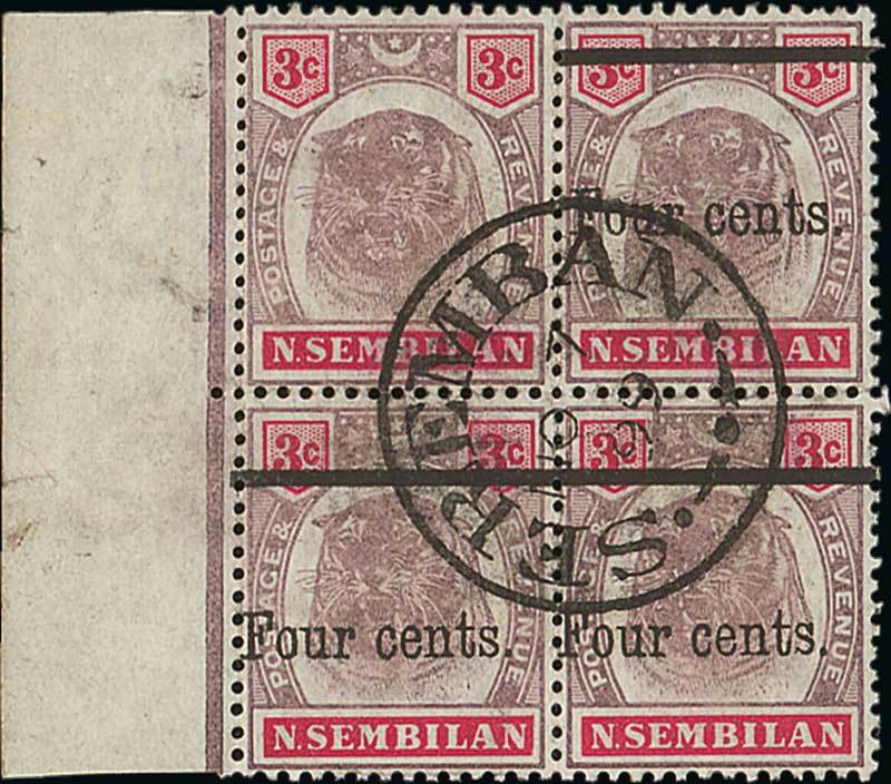 "Four cents." on 3c. dull purple and carmine block of four with margin at left, the upper left stamp variety without surcharge, centrally cancelled by Seremban c.d.s. (7.11.99), fine. Very rare. S.G. 17a, £6500. Photo