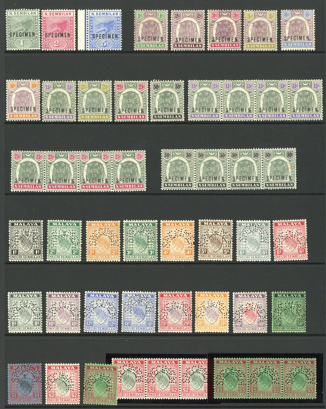 1891-1941 complete collection of overprinted and perforated Specimen stamps with additional 1895-99 15c., 25c. and 50c. in strips of four and 1935-41 $2 and $5 in strips of three, fine mint. Cat. £515+