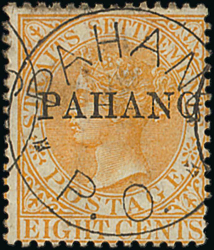 2c. pale rose and 8c. orange cancelled by "pahang/p.o." circular undated h.s. and 10c. slate cancelled by part "jerantut" c.d.s., the 8c. with thinned corner perf otherwise fine. S.G. 1-3, £2125. Photo for 8c.