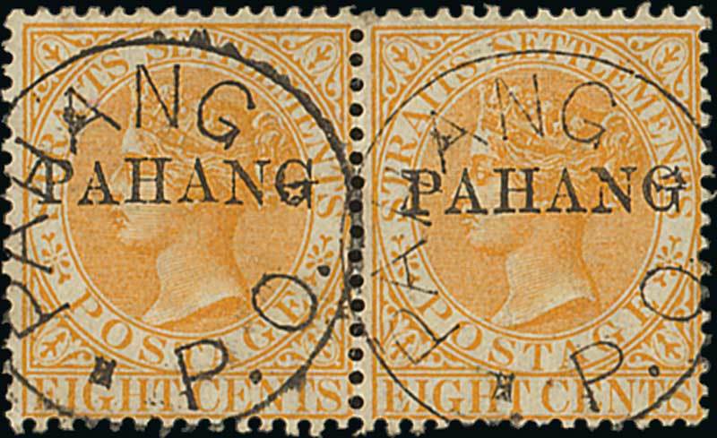 8c. orange pair, both neatly cancelled by "pahang/p.o." circular undated h.s., fine. A rare multiple. R.P.S. Certificate (1975). S.G. 2, £3600. Photo