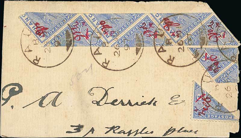 2c. on half 5c. blue and 3c. on half 5c. blue, a se-tenant strip of six plus 3c. on half 5c. blue (2, one with part of adjoining stamp) on part of 1897 (26 Aug.) to Singapore, all tied by "raub" c.d.s. and showing, on reverse, part Kwala Kubu and Singapore (30.8) datestamps; a few small faults. Rare. Friedl Certificate (1967). S.G. 18b, 19; £4100+. Photo