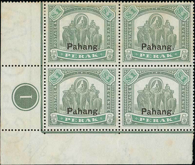 $1 green and pale green lower left corner block of four with plate number, unused with part original gum, some brown marks on reverse not affecting fine appearance. A rare multiple. S.G. 23, £1600. Photo