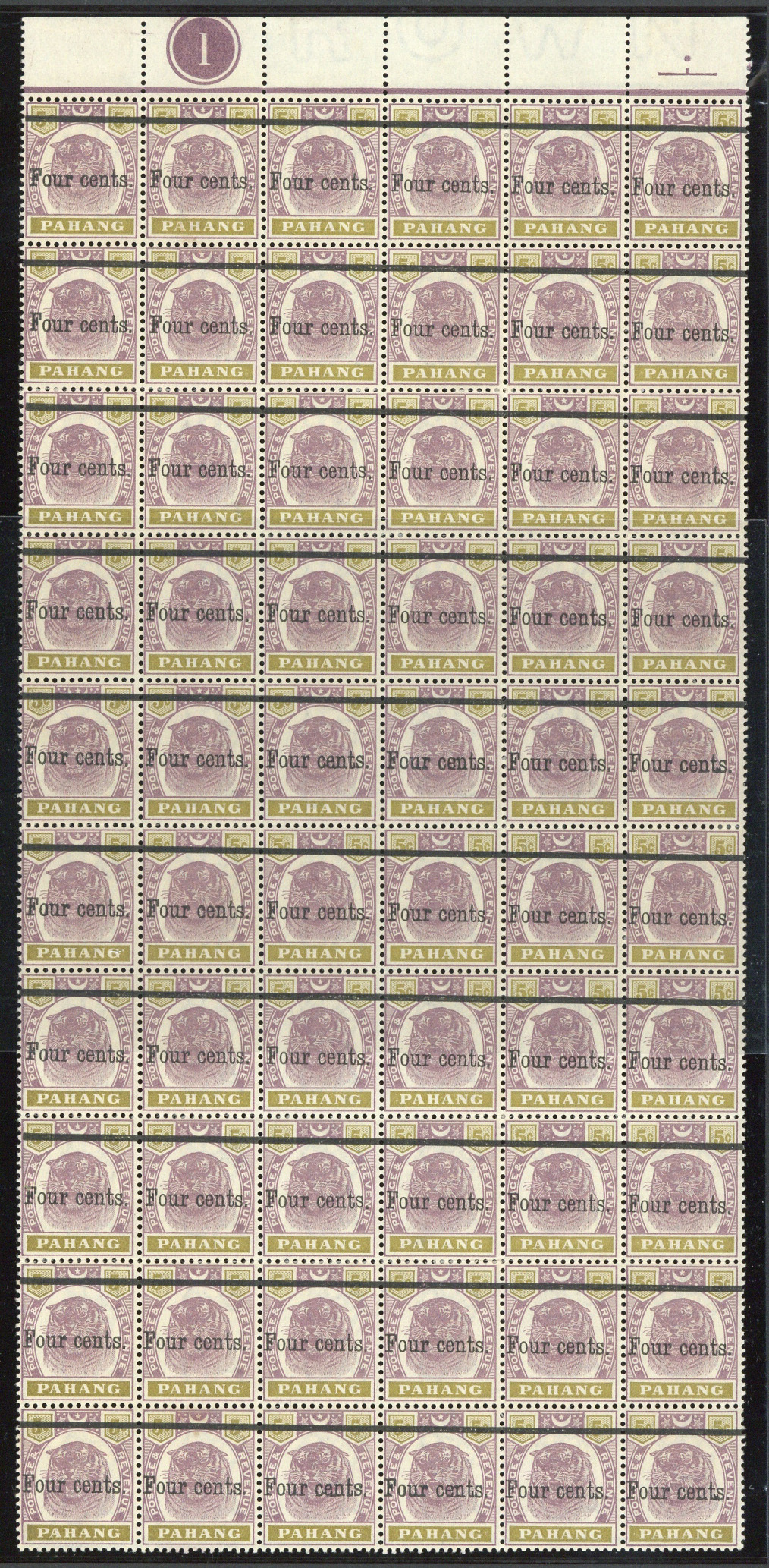 1899 (May) 4c. on 5c. dull purple and olive-yellow, a complete mint pane of sixty (6x10) with margin at top, [15] and [45] with raised "s", fine mint. S.G. 28, £1440