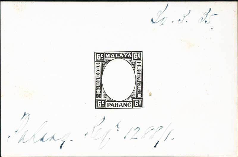 6c. frame in black on glazed card (92x60mm.), marked "Pahang Reqn 1288/1" and dated "30.3.35", fine. Photo