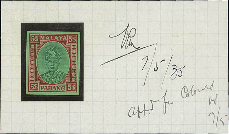 "5$" in green and red on emerald hinged on piece (87x53mm.) marked "Apprd for colour", initialled and dated "7/5/35", fine. Photo