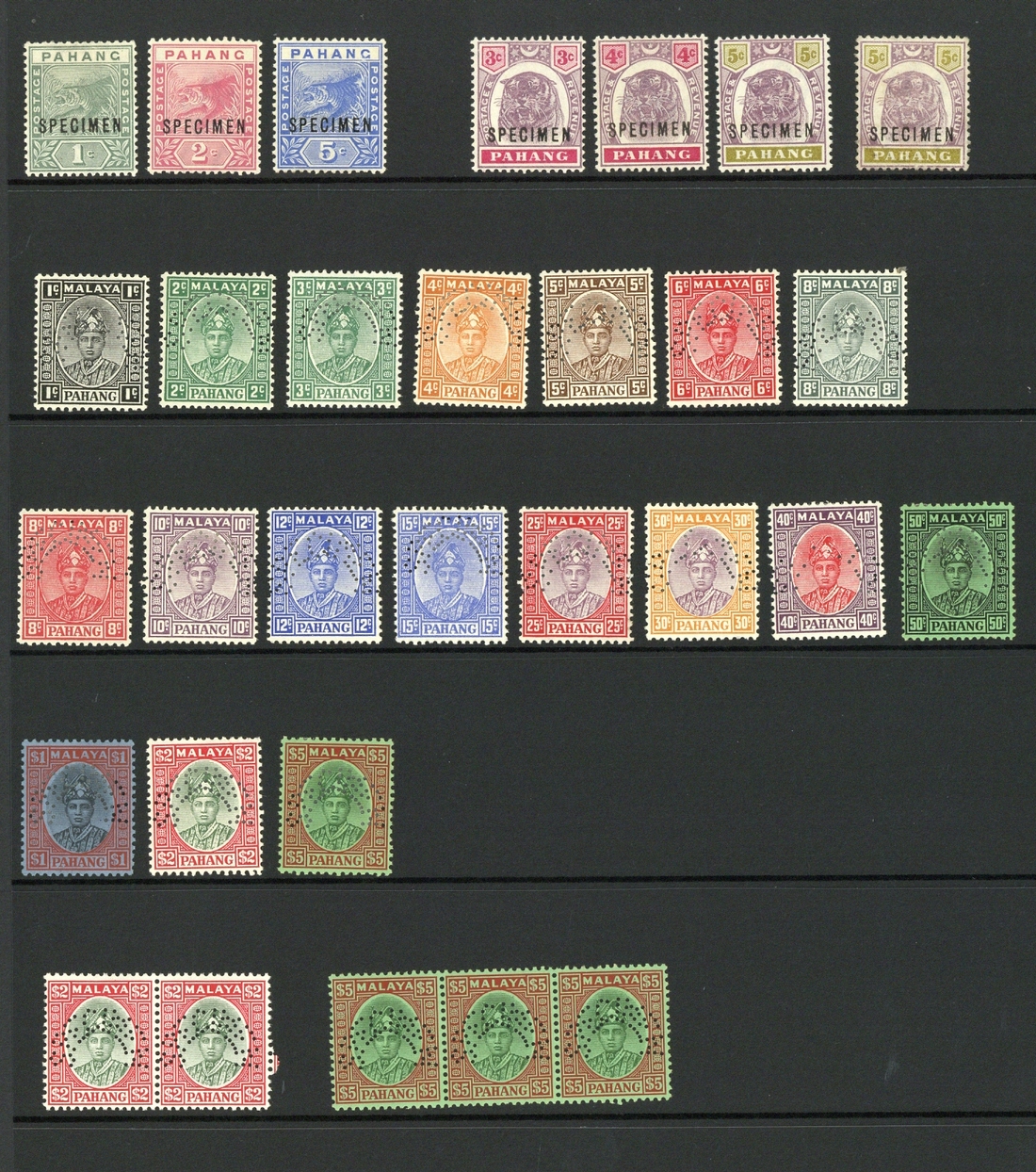 1891-1941 complete collection of overprinted and perforated Specimen stamps with additional 1897 5c. and 1936 $2 pair and $5 strip of three, fine. Cat. £650+