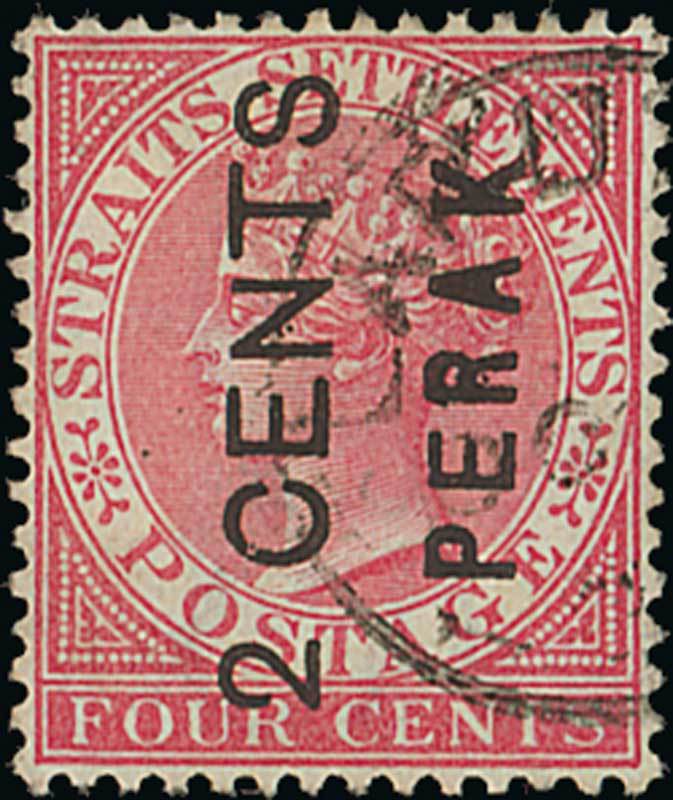 A single with Type 11, cancelled by part Larut c.d.s., fine. S.G. 15, £500. Photo