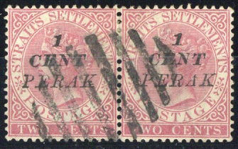 1c. on 2c. pale rose with Type 25, a horizontal pair centrally cancelled by oval of bars, one short perf at left otherwise fine. S.G. 28, £400