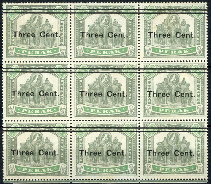 3c. on $1 green and pale green block of nine, the centre stamp in the top row showing thinner "t" in "Cent", fine unused with small part original gum. S.G. 86/86a, £740