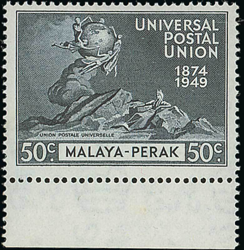 1949 U.P.U. 50c. blue-black with margin at foot, variety "C" of "CA" missing from watermark, fine unmounted mint. Very rare. S.G. 127a, £800. Photo