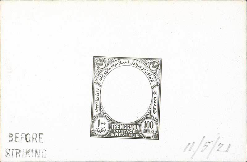 $100 frame in black on glazed card (92x60mm.) marked "before striking" and dated "11/5/21", fine. Photo