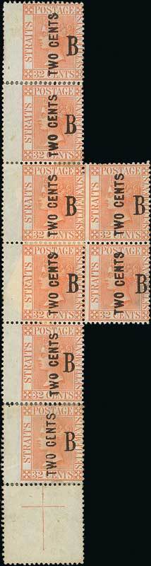 "two cents" on 32c. pale red, and irregular block of eight with interpanneau margin at foot, comprising a vertical strip of six with interpanneau margin at left showing two complete triplets with the centre pair being part of a block four, the right vertical pair with both types, traces of gum in places, one thinned, creases and perfs much re-inforced with selvedge or hinges, nevertheless a most remarkable piece. S.G. 12-13, £28,250. Photo