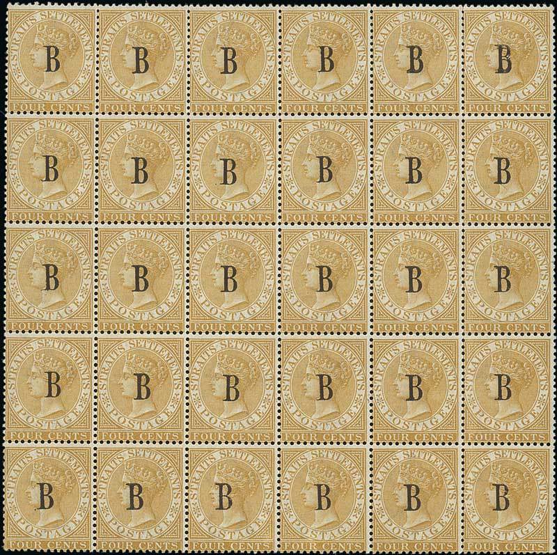 4c. pale brown block of thirty (6x5), fresh and fine unmounted mint. A magnificent showpiece. B.P.A. Certificate (1980). S.G. 17, £3000. Photo