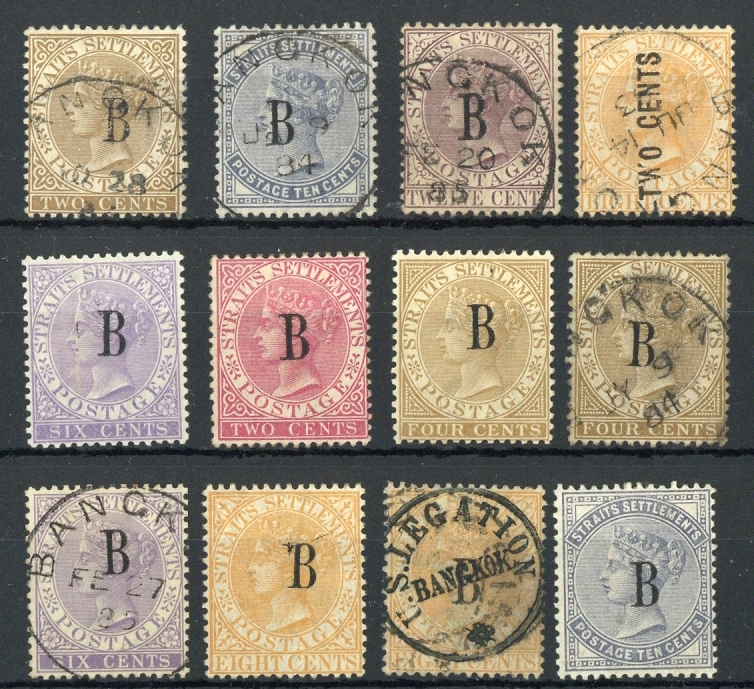 CC 6c. lilac and CA 2c. pale rose, 4c. pale brown (2, one used), 6c. lilac used (B.P.A. Certificate, 1980), 8c. orange (2, one used with U.S. Legation cachet - B.P.A. Certificate, 1980) and 10c. slate, fine; also four Straits Settlements stamps, two with part German Consulate h.s. in blue and two with part Bangkok firm's chop three forgeries. Cat. £1295