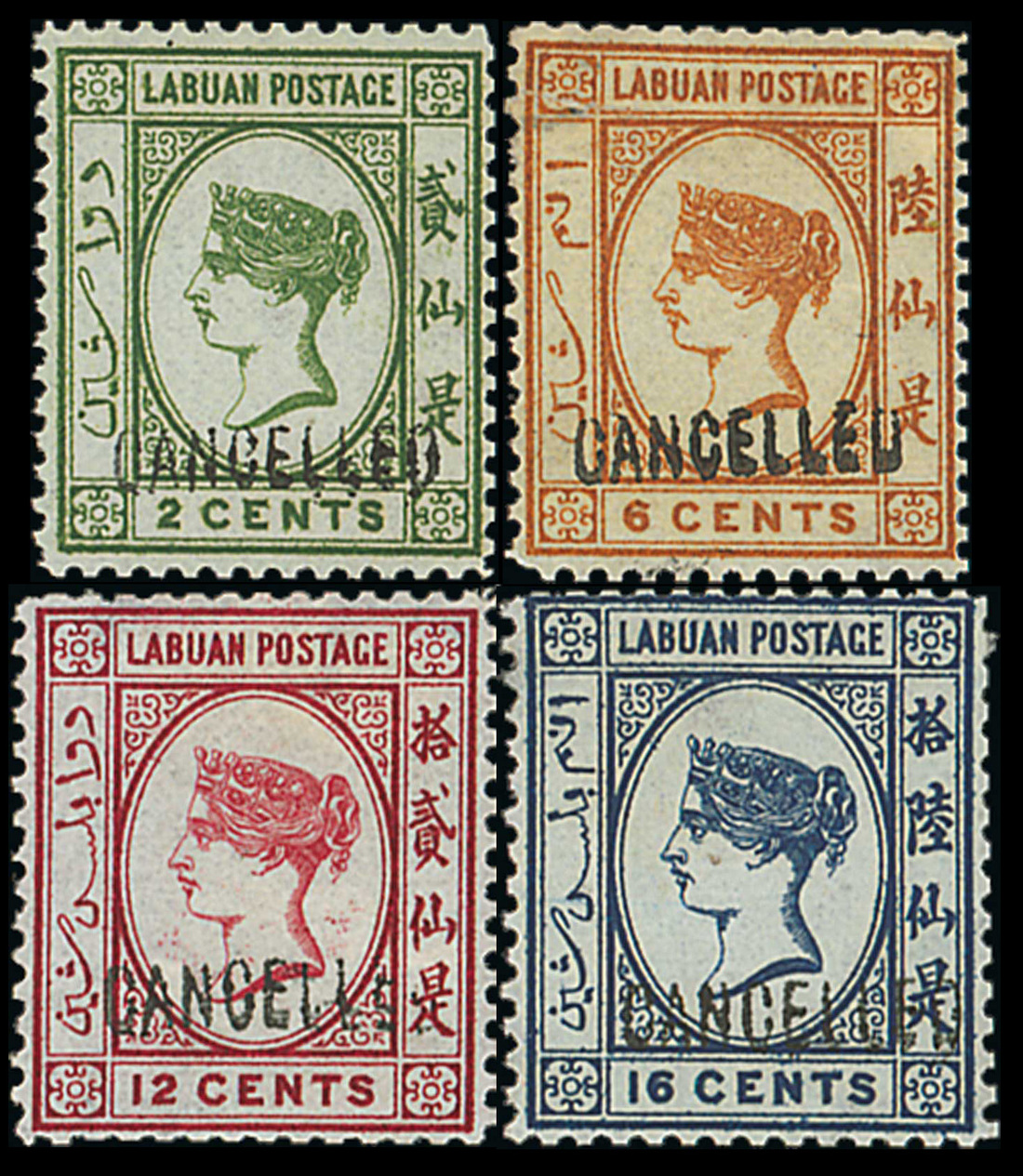 2c. in yellow-green, 6c. orange-brown (tear at upper left), 12c. carmine and 16c. blue, each handstamped "cancelled" (Type D7), all with some gum; perforations trimmed in places and other small faults. . Extremely rare. S.G. 1-4. Photo