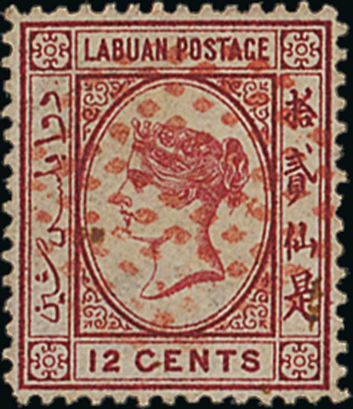 12c. carmine, [8] showing no right foot to second Chinese character, neatly cancelled by red circle of dots, tiny natural paper inclusion at left, fine. S.G. 3a, £1600. Photo