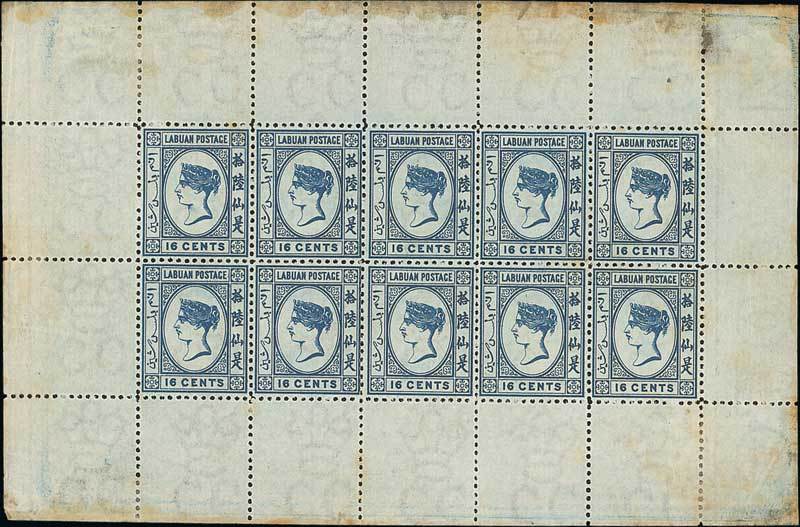 16c. blue, a complete sheet of ten (5x2), unused with virtually full original gum; some hinge remnants, light stains and thin in selvedge. Rare. R.P.S. Certificate No. 43,746 not present. S.G. 10. Photo
