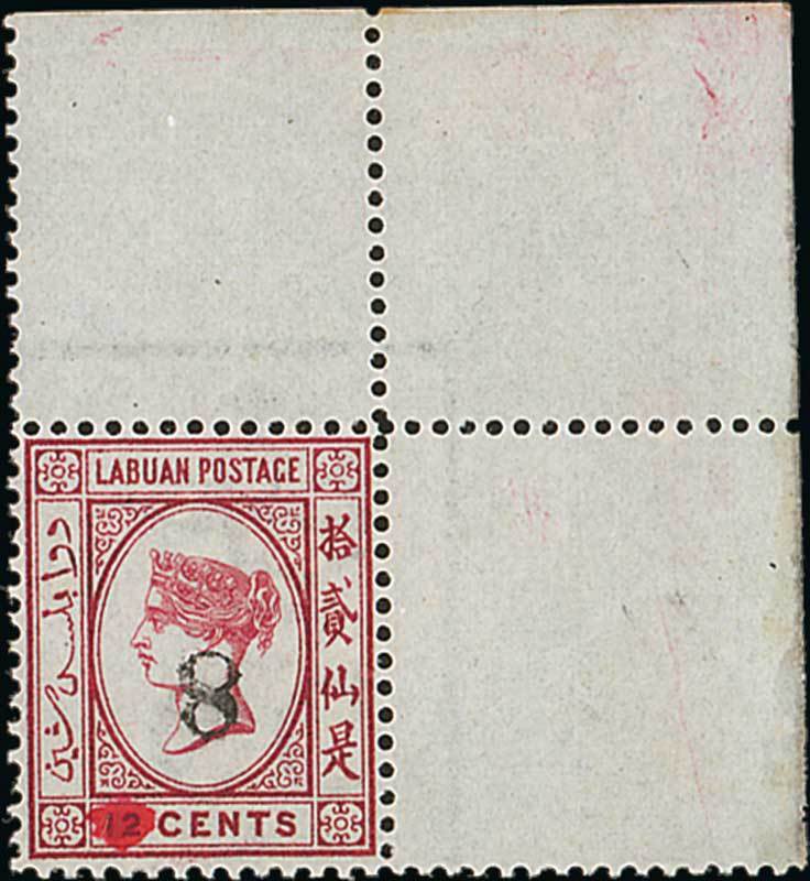 "8" on 12c. carmine with bar in red, a top right corner example, [5], showing variety "8" inverted, fresh and fine unused with large part original gum. S.G. 11a, £2000. Photo