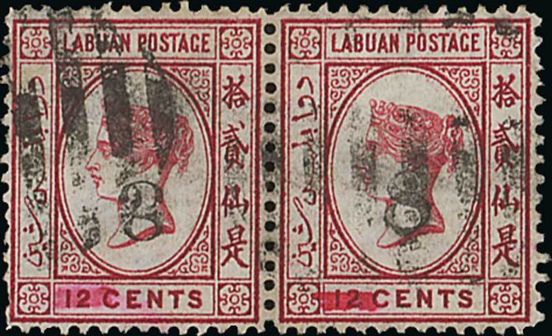 "8" on 12c. carmine with bar in red, a pair [1-12] cancelled by oval of bars, the left stamp showing variety "8" inverted, fine used. A rare multiple. R.P.S. Certificate (1984). S.G. 11/11a, £1850. Photo