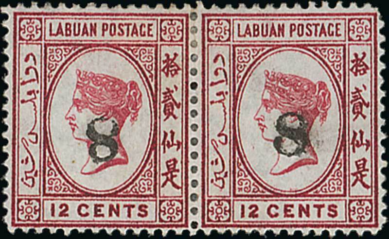 "8" on 12c. carmine horizontal pair, [3-4], with "12" not obliterated and the left stamp with "8" inverted, unused with part original gum, perforations between part re-inforced. Almost certainly a unique multiple. R.P.S. Certificate No. 16,750 not present. S.G. 11b/11c. Photo