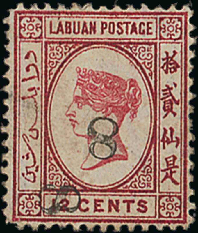 "8" in black on 12c. carmine, variety upright "8" inverted, unused without gum, fine. B.P.A. Certificate (1982). S.G. 13b, £2250. Photo