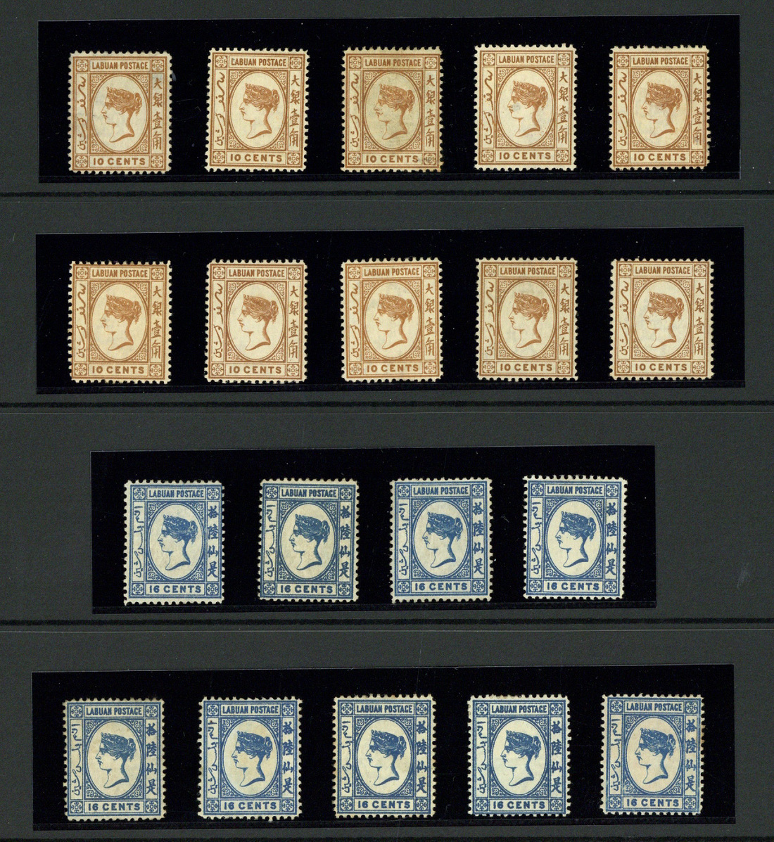 10c. yellow-brown complete unused reconstruction of the sheet of ten (5x2), four with original gum, and 16c. blue almost complete reconstruction (missing [5]), five with gum; mostly good to fine. S.G. 19-20, £1450