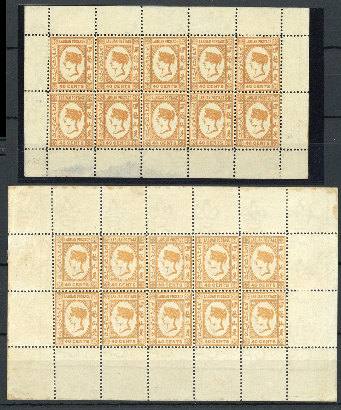 40c. amber, two complete sheet of ten (5x2), one with watermark reversed, unused with large part or full original gum; the variety with some thins in the bottom margin. S.G. 21, 21x,; £640+