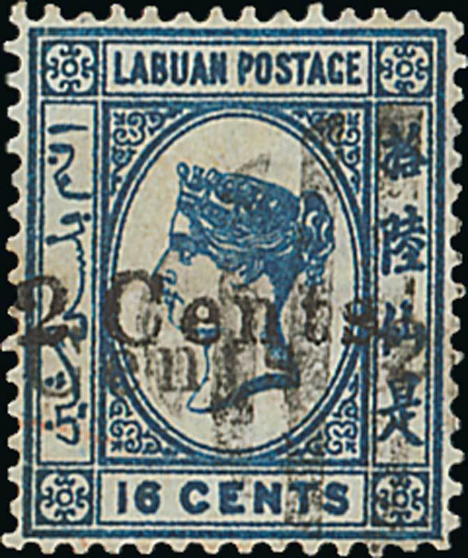 "2 Cents" on 16c. blue, variety surcharge double, cancelled by oval of bars leaving both impressions clearly visible. Extremely rare. S.G. 25a, £7000. Photo