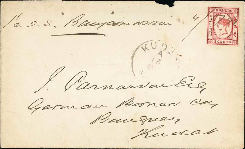 1891 (May) envelope to Kudat, marked "Per S.S. Banjamassai", bearing 2c. pale rose-red tied by manuscript date "4/5/99" and showing Kudat c.d.s. (13.5) alongside; the envelope a little roughly opened resulting in small piece missing at top. Unique. B.P.A. Certificate (1989). Photo