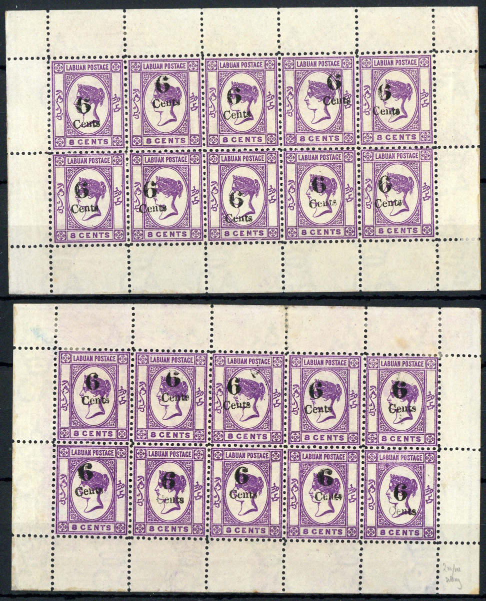 6c. in black on 8c. mauve, two complete mint sheets (5x2), both 2mm. setting, one sheet with two stamps thinned the other sheet fine. S.G. 35, £358