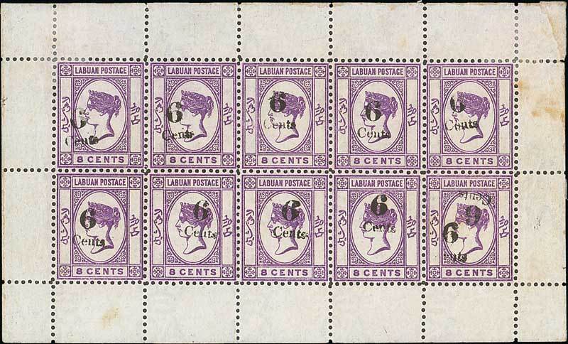 6c. in black on 8c. mauve, 2mm. setting, a complete mint sheet, [10] showing surcharge double, one inverted; light stain in selvedge at right otherwise fine. S.G. 35/35b, £1044+. Photo