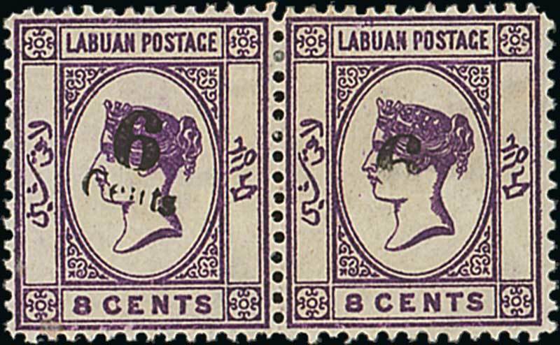 6c. in black on 8c. mauve horizontal pair, 1mm. setting, the right stamp showing top part of "6" only, fine mint. Photo