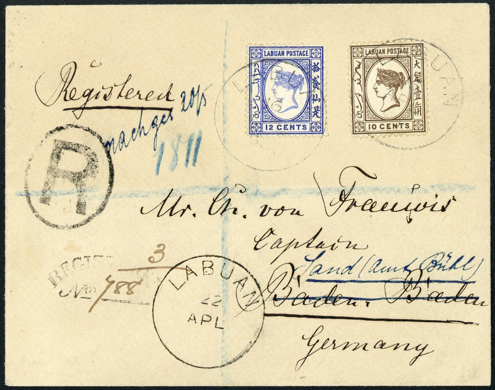 1892-93 10c. brown and 12c. bright blue neatly tied by light Labuan c.d.s. on 1898 (22 Apr.) envelope registered to Germany and redirected locally, showing "R" in oval, "registered/No" h.s. and, on reverse, Brindisi and arrival datestamps. Most attractive