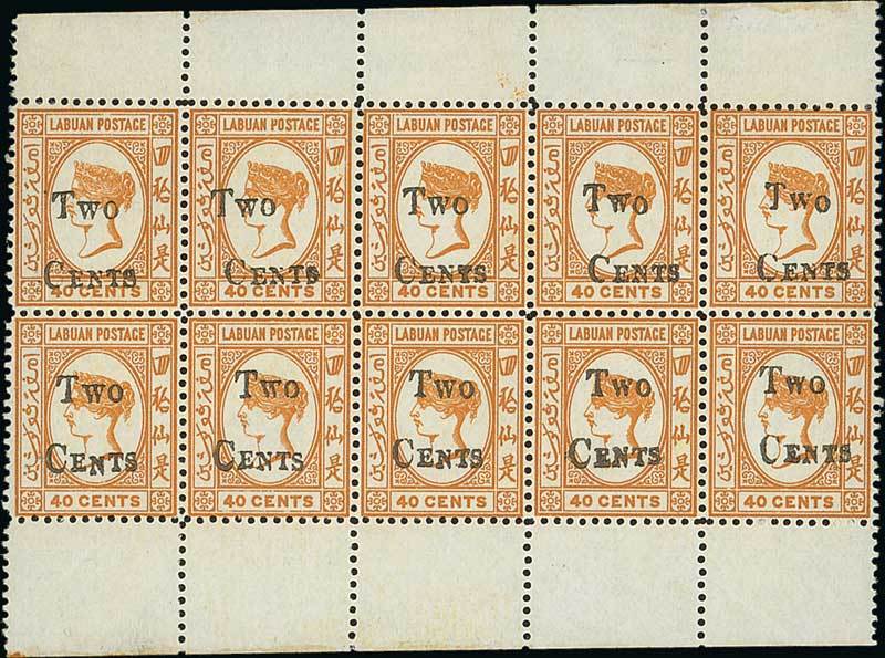 "two/cents" on 40c. ochre, a complete sheet (5x2) with margins at left and at right missing, fine mint. S.G. 49, £1170+. Photo