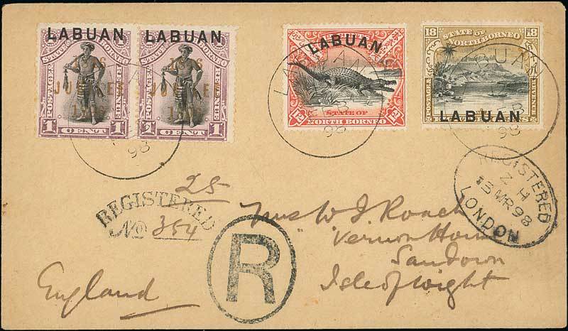 1c. black and grey-purple pair with overprint in orange used with 1897 Pictorial 12c. and 18c. on 1898 (Feb.) envelope registered to the Isle of Wight, all neatly tied by Labuan c.d.s., fine. Photo
