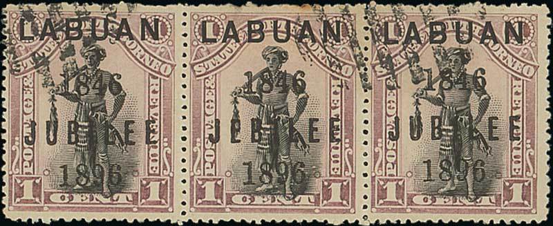 1c. black and grey-mauve strip of three [76-78], [77] showing variety "jebilee", cancelled to order; the centre stamp with stained perf at top otherwise fine. R.P.S. Certificate (1999). S.G. 83c, £300. Photo