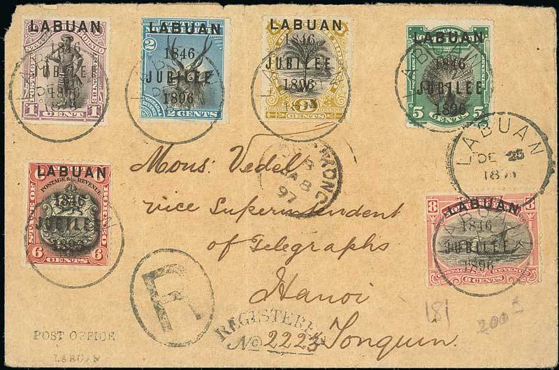 6c. black and brown-lake, variety overprint double, fine used with normal 1c., 2c., 3c., 5c. and 8c. on 1896 (25 Dec.) envelope (small faults) registered to Hanoi, all neatly tied by Labuan c.d.s. and showing registered h.s. S.G. 87a, £650. Photo