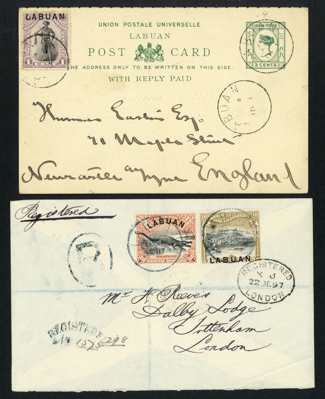 1897 (Nov.) "Reeves" envelope registered to London, bearing 12c. and 18c. tied by Labuan c.d.s. in blue and showing registration h.s. and arrival d.s.; also 1896 (June) 3c. reply paid card to England uprated with 1894 1c., fine