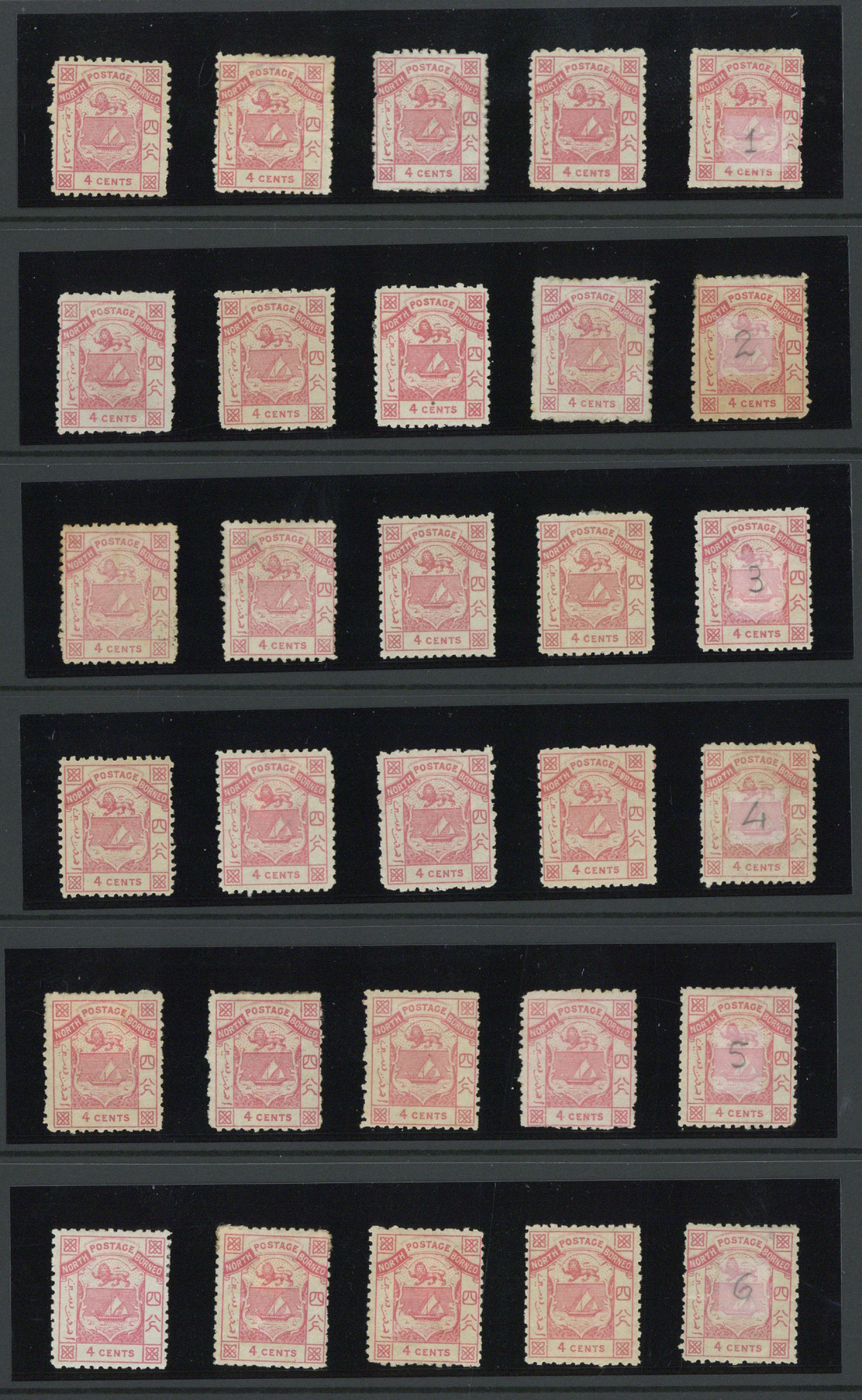 4c. pink selection comprising unused/mint (56 with marginal block of three and pair, and one perforated with part "cancelled") and used (3); fair to fine. S.G. 6, £3,500