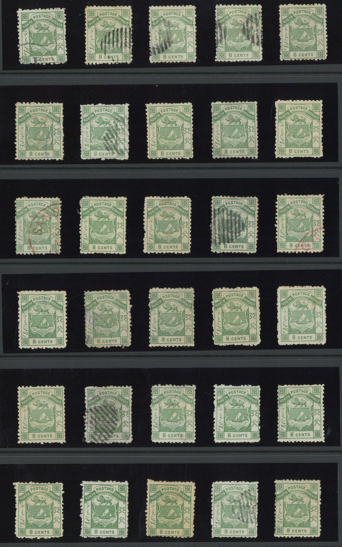 8c. green selection comprising unused/mint (57 with a block of four and a single perforated with part "cancelled") and used (36, some with c.d.s., a few in red); fair to fine. S.G. 7, £7,500+