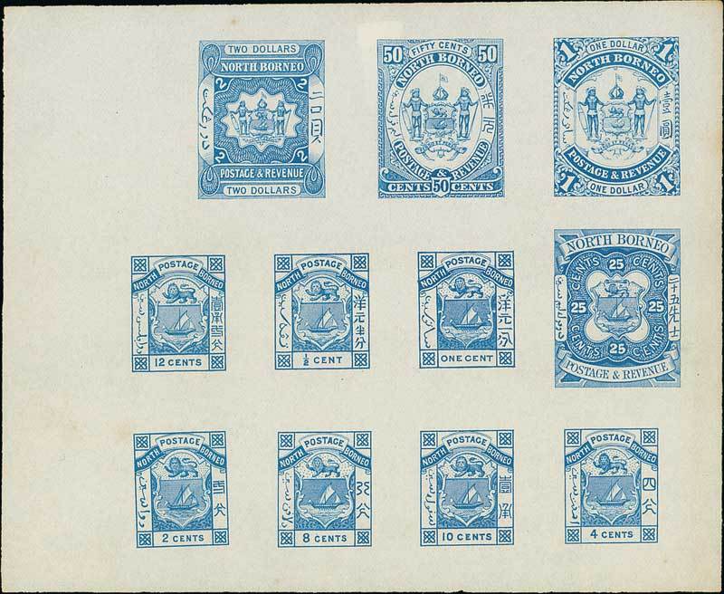 ½c., 1c., 2c., 4c., 8c. and 10c. together with unissued 12c., 25c. and $2 and 1883 50c. and $1, in greenish blue on thin wove paper (143x117mm.). Photo