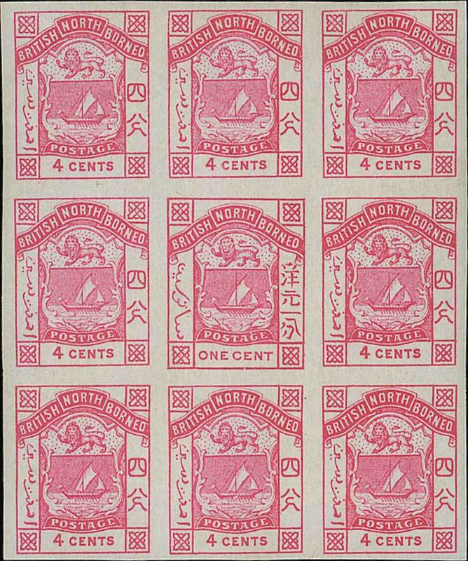 4c. pink Transfer A imperforate block of nine, [13] showing 1c. transfer error, lightly mounted mint; traces of gum creasing. A very rare multiple with the transfer variety. S.G. 26a/db, £6,600+. Photo