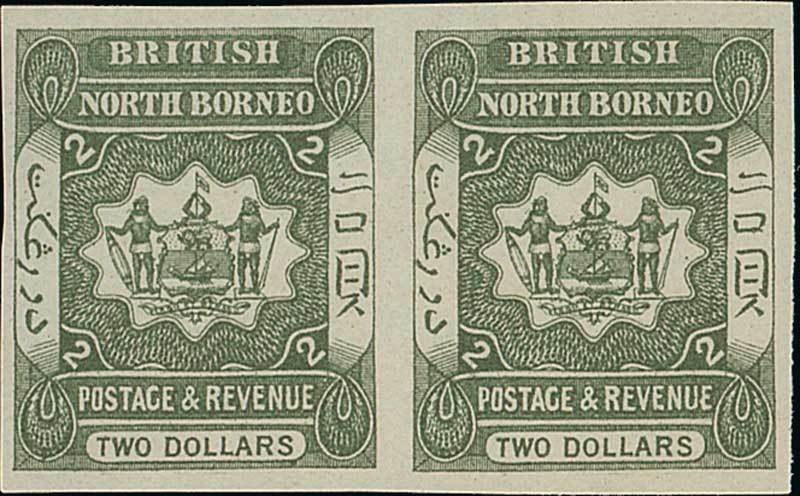 $2 sage-green horizontal pair, variety imperforate, fresh without gum. S.G. 32a, £600. Photo
