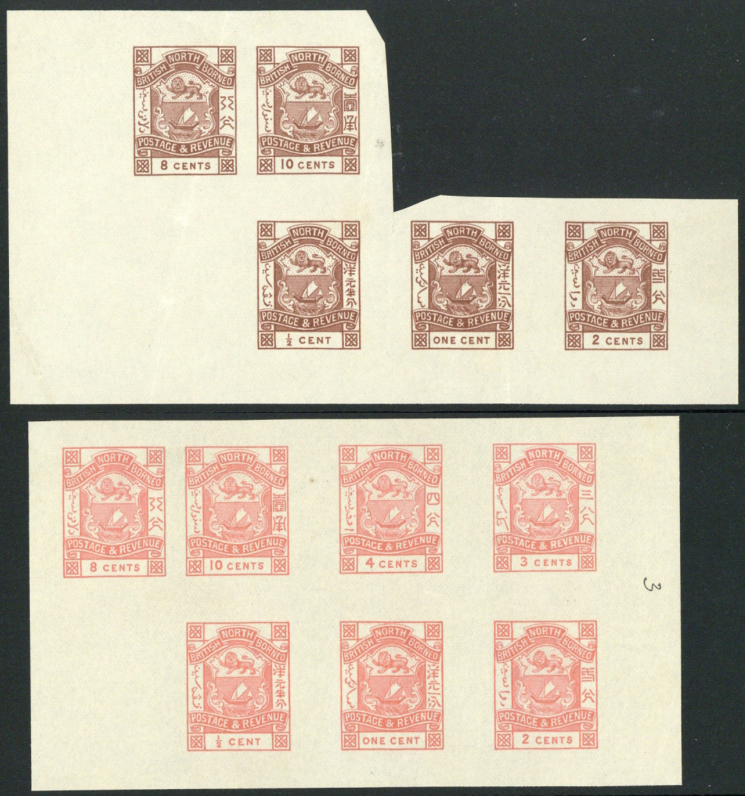 ½c. to 4c., 8c. and 10c. in aniline pink cut from the composite sheet, on wove paper (119x67mm.), and a similar group of the ½c., 1c., 2c., 8c. and 10c. in red-brown on wove paper (133x72mm.)