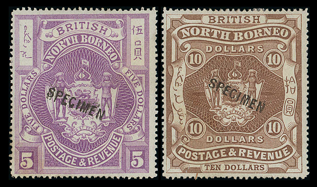$5 bright purple and $10 brown, both handstamped "specimen", fine mint. Rare. S.G. 49, 50. Photo
